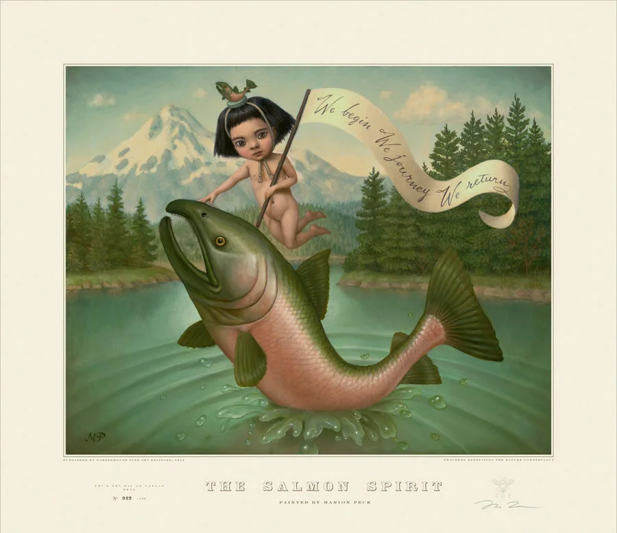 “The Salmon Spirit”, by Marion Peck, is a limited edition, signed and numbered giclee print on archival paper. All proceeds from the print will benefit the Nature Conservancy.